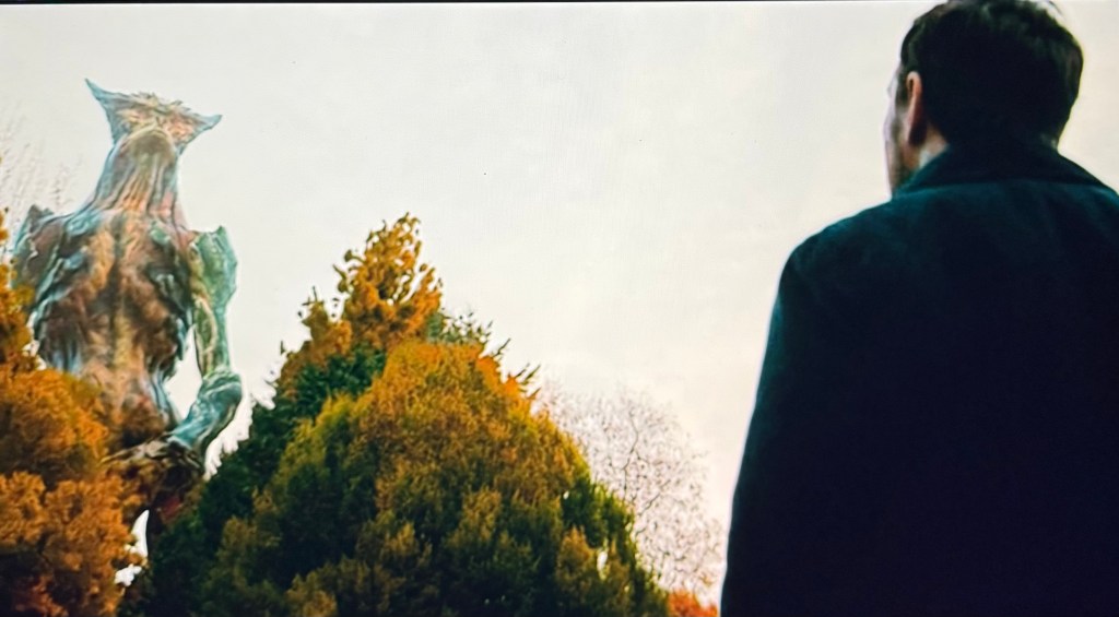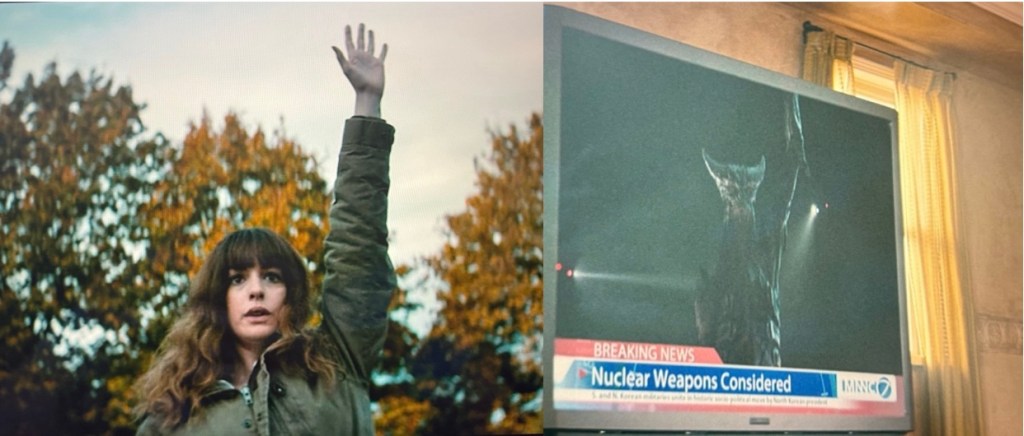 Varias horas después de haber regresado del bar, Gloria despierta en la casa de sus padres y, claramente con resaca, se entera por medio de una amiga que un monstruo gigante apareció en Seúl causando terror generalizado y daños materiales a la ciudad. Aquí es clave la reacción exacerbado terror de Gloria al ver al monstruo en internet. Uno llega a tener la impresión de que su miedo es incluso injustificado al encontrarse ella tan lejos de su objeto. Aquí es donde encontramos una de las primeras consideraciones filosóficas de la película que sólo podemos aprehender desde una mirada simbólica (para saber más de esta mirada léase el primer apartado de mi ensayo MEN (Garland, 2022) El terror de Eva).
