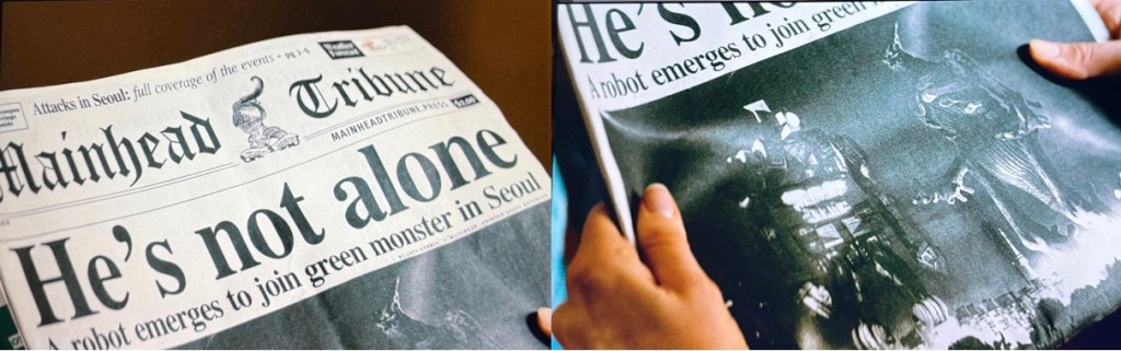 Horas después, estando en el bar donde ahora ya trabaja como mesera gracias a la “cordialidad” de Oscar, Gloria ve por la televisión la más reciente emergencia del monstruo el cual, para su gran sorpresa, parece imitar los movimientos de brazos que ella realizó unas horas antes al platicar con Tim. El monstruo tiene una mano a la altura de su oído derecho similar a como si estuviera sosteniendo un celular y segundos después pareciera lanzar un “objeto invisible”. Esta increíble coincidencia hace que Gloria investigue un poco más y vea el avistamiento del día previo y, para su sorpresa, esa noche en Seúl el monstruo parecía cargar con algo a sus espaldas de la misma manera que ella cargaba con su colchón inflable.