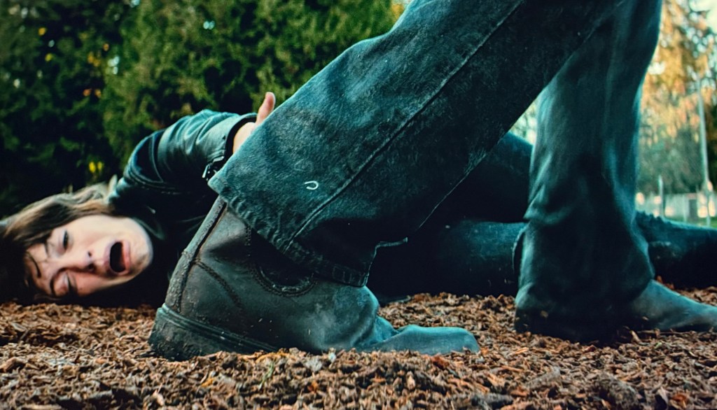 De la misma forma y en viceversa, todo aquello que no podemos entender y, por lo tanto, nombrar, se nos presenta como un monstruo. Aquellas criaturas y fenómenos que escapan de nuestras redes lingüísticas y se mantienen inconquistables por la razón humana. Es el terror que causa la confrontación con lo Real monstruoso el que refleja la raección de Gloria ante la criatura de Seúl. La protagonista no teme que este lo vaya a seguir hasta Mainhead, se aterroriza al percatarse de que existe este Otro monstruoso violentamente independiente a todo control humano ante el cual, tal como vemos en el fotograma de abajo, pierde todo lenguaje.